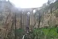 The Puente Nuevo (Spanish pronunciation: [ˈpwente ˈnweβo], "New Bridge") is the newest and largest of three bridges that span the 120-metre-deep (390 ft) chasm that carries the Guadalevín River and divides the city of Ronda, in southern Spain. Completed in 1793, the architect was José Martin de Aldehuela and the chief builder was Juan Antonio Díaz Machuca.