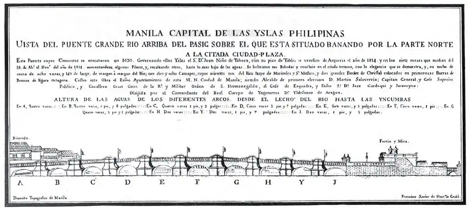 Construction work was directed by the Recollect priest Lucas de Jesus María. The bridge, as built, consisted of stone piers and a wooden superstructure. At the south end of the bridge was a structure called Fortín y Mira (small fort and look-out). Its use was to guard this approach to the city as part of the defense of Manila. The wooden superstructure, besides being more easily and cheaply built, had a military value in that communications between the two parts of the city, as divided by the river, could be easily and quickly destroyed by destroying the woodwork. This was done during an insurrection of the Chinese in 1638.[1]