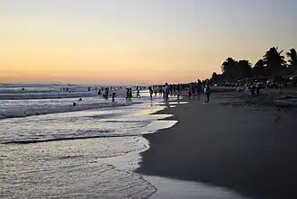 Puerto Arista has thirty two km of wide beaches facing open ocean.[12] From the beach area, the peaks of the Sierra Madre de Chiapas can be seen in the background, which are often covered with clouds.[2] The climate is hot and semi humid with most rain falling in the summer. The average annual temperature is 27C.[13] These beaches have fine, gray, volcanic sand, flocks of frigatebirds visible.[1][2][5] The surf can be heavy but this is not common. At low tide, the surf is gentler and safer for swimming.[1][6] However, the most dangerous aspect about the water is riptides, capable of sweeping people out to sea.[5] These mostly occur beyond the second line of wave breaks. There are no indications as to the safety of the waters and no professional lifeguards.[6] In 2008, 27 of the 41 near drowning incidents in Chiapas occurred in Puerto Arista.[11]