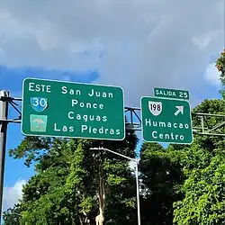 Puerto Rico Highway 198 (PR-198) is a 15-kilometre-long (9 mi) highway that parallels Puerto Rico Highway 30 from Juncos, Puerto Rico, to Humacao, Puerto Rico, where it ends at Puerto Rico Highway 3. Like Puerto Rico Highway 189, it passes through the business centers of Juncos, Las Piedras and Humacao.[2][3]