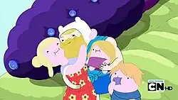 ![]() An adult Finn, surrounded by his pillow family. For his character designs in the episode, Andy Ristaino won the series' first Emmy Award. | |