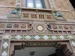 In preparation for the restoration work, the structural and architectural engineering firm Wiss, Janney, Elstner Associates completed an evaluation of the building's eastern and southern facades, focusing on its terra cotta portions. By using ultrasonic testing, engineers were able to evaluate the state of the terra cotta without further damaging the pieces. Severely cracked or damaged pieces were partially removed and a report was written from these findings. This report provided recommendations for the masonry facade and terra cotta repair work.[23] Restoration work began in spring 2009 and is scheduled for completion in early 2010. All of the damaged terra cotta elements have been replaced on the south tower and parapet, and scaffolding has been erected on building's eastern facade in preparation for further restoration work.[17] Fully restoring the building's exterior terra cotta pieces and clay roof tiles is the first step in a long-range $2 million repair plan.[21]