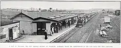 The railway from Ōtāhuhu reached West Pukekohe in 1873[5] and the line opened to Mercer on 20 May 1875,[6] though initially there was no goods service.[7] The station caused the town centre to be refocused along King Street.[8] A rimu and kauri[9] 4th class station[10] and stationmaster's house[11] were built in 1875.[12] In 1875 Pukekohe had two trains a day in each direction taking about 2 hours from Auckland.[13] In 2019 journeys to Auckland took 1hr 11mins, running half hourly.[14] Additions were made in 1878 and 1883, so that by 1884 it also had a cart approach to the platform, a 60 ft (18 m) by 30 ft (9.1 m) goods shed, loading bank, cattle yards, weighbridge and urinals. In 1902 the station had an iron roof and contained a ladies' waiting room, public vestibule, railway and postal room, and porter's room. There were four sidings in connection with the station, and the staff consisted of the stationmaster, two cadets, a messenger, and a porter.[15] There was a Post Office at the station from 1883 to 1909,[10] though a conflict between the departments in 1883.[16] Further railway houses were added in 1909, 1911 and 1955.[10]