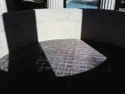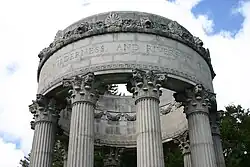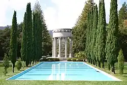 The permanent water temple was completed in 1938, replacing an original made largely of plywood.[1][2] Designed by architect William Merchant and with carving by Albert Bernasconi, it consists of a circle of fluted Corinthian columns surmounted by a large masonry ring bearing the inscription "I give waters in the wilderness and rivers in the desert, to give drink to my people" [from Isaiah 43:20]. There is a reflecting pool lined with cypress trees.[2]