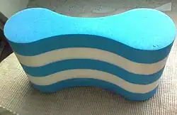 A pull buoy or leg float is a figure-eight shaped piece of closed-cell foam used in swim workouts. Swimmers place the buoy between their thighs or their ankles to provide support to the body without kicking their legs; this allows the swimmer to focus on training only their arms[1] and developing both endurance and upper body strength.