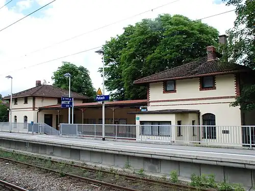 Pullach station is a station on the Isar Valley Railway from Munich to Bichl in the German state of Bavaria. It has been part of the Munich S-Bahn since 1981. The station is located in the municipality of Pullach, which also contains the stations of Großhesselohe Isartal and Höllriegelskreuth. It is classified by Deutsche Bahn as a category 6 station[2] and has two platforms. The station building is registered as a historic building on the List of Bavarian Monuments and has been acquired by the municipality of Pullach, which operates it.