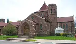 The building was designed by Solon S. Beman in the style of Old English Gothic with Richardsonian Romanesque features. Its long, low horizontal profile outside and its arrangement and general layout inside anticipate modern architectural trends several decades later.[3] Beman found rough hewn locally quarried Medina pink sandstone complementary to the simple forms and heavy proportions of the Richardsonian style.[4] The result is a compact, centralized building with a tower reminiscent of that over the crossing of Richardson's Trinity Church (1872) in Boston. Beman's use of unpolished stone pierced by unmolded windows that reveal the thickness of the fabric, added to the overall composition of distinct units unified by strong horizontality and subordination to the crossing tower conform to Richardsonian tradition. The main entrance is made of a series of stone moldings, with oak plank doors and decorative wrought iron hinges. Like many Richardson churches, exterior massiveness and sobriety give way to spaciousness and color on the interior.[5]