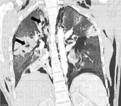 A pulmonary laceration is a chest injury in which lung tissue is torn or cut.[1] An injury that is potentially more serious than pulmonary contusion, pulmonary laceration involves disruption of the architecture of the lung,[2] while pulmonary contusion does not.[3] Pulmonary laceration is commonly caused by penetrating trauma but may also result from forces involved in blunt trauma such as shear stress. A cavity filled with blood, air, or both can form.[2] The injury is diagnosed when collections of air or fluid are found on a CT scan of the chest. Surgery may be required to stitch the laceration, to drain blood, or even to remove injured parts of the lung. The injury commonly heals quickly with few problems if it is given proper treatment; however it may be associated with scarring of the lung or other complications.