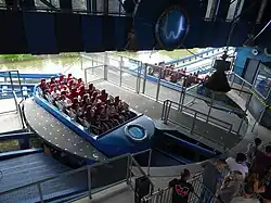 Once riders are loaded, the turntable station rotates to align the car with the rest of the track.[3] The car then accelerates backward over a small hill before traveling through a straight section of track. This straight section of the track goes through the ride's splashdown pool, which at this point in the ride is low enough to allow the vehicle to pass over it. The car then travels part of the way up a vertical spike of the track before traveling forward over the hill. The car then launches forward into a second vertical spike and comes back down before entering a third backward launch. While the car is on the vertical spike at the back end of the ride's layout, the water flows into the splashdown pool in approximately six seconds raising the level. The car then travels down the spike and enters the splashdown pool, which is now filled with water. This serves to slow the car down before it re-enters the turntable to unload riders.[3][4]