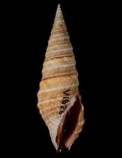 The length of the shell varies between 20 mm and 32 mm. The elongate shell has a sharp spire. It has a pale grey color with dark, longitudinal, irregularly scattered strigae, tinted on both sides in a dark color. The shell contains 11 whorls. The sutures are hardly impressed. The body whorl is slightly convex with 7 - 8 carinae. The small aperture is elongate-oval. The outer lip is deeply sinuated. The siphonal canal is very short.[2]