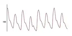 | Pulse pressure waveform displaying the variation in pressure between beats in pulsus alternans. | |
