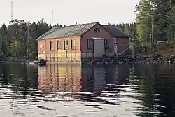 A red-brick pumping station on the shore of Lake Näsijärvi in Tampere, Finland