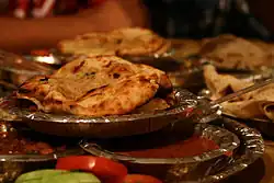 Dairy products are a staple in Punjabi cuisine.[18] Both cow milk and water buffalo milk are popular. Milk is used for drinking, to add to tea or coffee, to make homemade dahi (yogurt), for butter and making traditional Punjabi cottage cheese called paneer.[19] Traditionally, yogurt is made every day using previous day's yogurt as the starting bacterial culture to ferment the milk. Curd is used as dressing for many raita dishes, to prepare Kadhi, to prepare cultured buttermilk (Chaas), and as a side dish in a meal.[20] Buttermilk is used in making various kinds of Lassi.[21][22][23] It may also be used in curry preparations.[24] Milk is also the prerequisite ingredient for butter and Ghee (clarified butter).