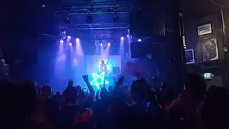 According to historian Gaye Theresa Johnson the emergence of ethnic punk rock bands in Los Angeles was a result of double marginalization of individuals within the African-American and Latino communities during the late 1970s.[24] She says some punk artists suggest that this double marginalization was necessary for these groups to develop the "D.I.Y." attitude associated with Punk Rock groups.[24] These bands drew upon their working class experiences and sexual and racial identities in their music.[24] Los Angeles' punk scene produced notable ethnic artist such as Alice Bag. Born Alicia Armendariz in 1958, Alice Bag, went on to become a member of punk rock groups Masque Era and the leader of the Bags.[24] Bag was one of the few female leaders in the Punk Rock scene in the 1980s. Bag says one of the things that inspired her to join the punk rock scene was being rejected by the leaders of her high school's Brown Berets club. Bags says the organization didn't think she was serious about civil rights issues because of her appearance.[24] Chicano and Chicana artists like Bag and Los Crudos challenged the idea that Punk Rock was an exclusively white genre by incorporating Spanish lyrics into their music.[24] Bag continues to participate in the Punk Rock scene four decades after her debut, making her first solo track in 2016.[25] Bag also continues to support the female punk rock scene in Los Angeles by interviewing and highlighting them on her website.[26]