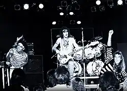 The Runaways, an all-female teenaged band featuring Joan Jett, Sandy West, and Micki Steele, formed in Los Angeles in 1975 under the management of Kim Fowley. The band combined elements of glam rock, hard rock, and proto-punk rock. The group would become one of the first punk or punk-adjacent bands anywhere to release recordings, with their self-titled debut LP and its single "Cherry Bomb" released the following year.[1]