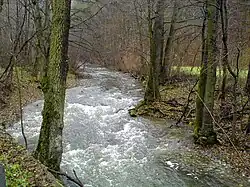 After leaving the caves Punkva flows through a valley and several fish ponds. Multiple small local streams are its right tributaries. It enters the Svitava on the southern side of Blansko and its flow joins the Danube watershed.