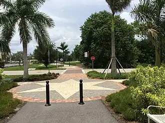 The Punta Gorda Linear Park runs along a former Florida Southern/Atlantic Coast Line Railroad right of way. First built in 1886, this railroad line was the Florida Southern's southernmost trackage (the rail line is still in service east of US 41 and is now operated by Seminole Gulf Railway). It was the terminus of the rail line until 1904 when it was extended to Fort Myers.[2] The rail line provided service to the historic Long Dock in Charlotte Harbor (located near the site of the Isles Yacht Club) from 1886 to 1897. Some of the line was reactivated in 1928 to serve the Maud Street City Dock (which is the dock that Fishermen's Village resides on) up until the early 1970s.[3]