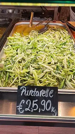 Puntarelle or cicoria di catalogna or cicoria asparago is a variant of chicory. The heads are characterized by an elongated shape (about 40–50 cm), light green stems and dandelion shaped leaves. 'Puntarelle' shoots have a pleasantly bitter taste.