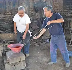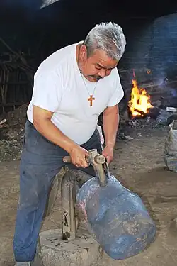 Their workshops are located in the town of Santa Clara del Cobre, which is about twelve km from Pátzcuaro and part of a region with a long history of handcrafts, passed down generations. Each of the various towns has its own specialty and for Santa Clara del Cobre, it is copper working, with over fifty workshops that employ more than 300 artisans, or about eighty percent of the town's workforce.[1][3] The town is known worldwide for its copper work, using traditional methods in open air workshops.[4] Hammers, tongs and other tools are found on workshop walls and tables and the copper is heated in a large wood-fired forge.(gmasters329-330) As the region no longer mines copper, the raw material is scrap copper from old autos and cable, which he buys from telephone and electrical companies.[5] Sledgehammers are used to pound blocks of copper to start and very fine hammers and awls are used for delicate details.[6] Pieces are reheated as necessary as the pieces is pounded into shape.[5] Decorative shapes such as animals are tapped outside the vessel from the inside and then backed with a substance called chapopote to keep the shape as the minute details are tapped in from the outside.[6]