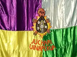 The Purépecha flag is the official flag of the Purépecha people, an Indigenous nation in Michoacán, Mexico. This flag consists of four fields of four colors with a shield and the words Juchari Uinapekua (Our Strength) below the shield. This flag is unique in its kind and emerged in the town of Santa Fe de la Laguna in 1980. It is a polity flag of Mexico.[1]