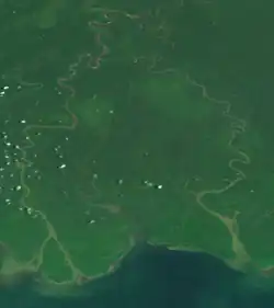 The Purari Delta is one of a number of large deltaic complexes which border the Gulf of Papua. Along with the Fly, the Kikori and many other rivers, the Purari drains the western and central highland region of Papua New Guinea. Upper sections of these rivers are located in highly mountainous terrain reaching 4,510 metres or 14,800 feet at Mt. Wilhelm, with steeply descending valleys debouching onto a deltaic plain 30 to 50 kilometres (19 to 31 mi) wide. Average annual rainfalls ranging from 2,000 to 8,500 millimetres (80 to 330 in) in the catchment of the Purari result in a mean annual discharge at delta of about 105 km3/a (3,300 m3/s), carrying 88.6 million m3/year of sediment into the delta (Pickup 1980; this volume). These inputs provide the material for a major deltaic complex of global significance.