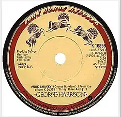 Thirty Three & 1/3 was released in November 1976, with "Pure Smokey" appearing as track 3 on side two of the original LP format,[41] sequenced between Harrison's remake of the Cole Porter standard "True Love" and "Crackerbox Palace".[42] As with "Ooh Baby" on Extra Texture,[43] the album cover included text dedicating the song to Robinson.[44] In Britain, "Pure Smokey" appeared as the B-side to the second single off Thirty Three & 1/3, "True Love", issued in February 1977.[45]