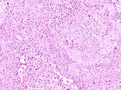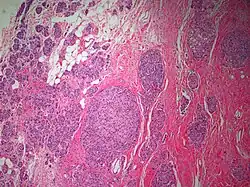 The microscopic histopathology of PACB tumors prepared with hematoxylin and eosin staining shows that >90% of the tumors consist of apocrine gland-like tissue. The lesions must also show that tumor cells have broken through their ducts of origin to invade adjacent tissue in at least one area. Most of the tumor cells (termed type A cells[15]) typically appear somewhat more irregular than normal apocrine gland cells. They have abundant eosinophilic (i.e. pink due to the uptake of the eosin dye) cytoplasm which contain numerous granules[11] and large mitochondria.[15] Their nuclei are large, variably sized and shaped, have multiple nucleoli (which are eosinophilic[11] and may be distinctively large in size[14]), and are surrounded by highly visible nuclear membranes. The cells are arranged into solid sheets, nests, papillae, and/or cords (see Figs. 1 and 2).[11] The tumor cells' cytoplasmic granules test positive when treated with the PAS diastase stain.[16] Binucleated cells, i.e. cells with two nuclei, are common.[10] Less commonly, type B apocrine cells are present; these cells have a more foamy and vacuolated cytoplasm (i.e. containing multiple vacuoles) than type A cells[15] and often resemble foamy histiocytes or sebaceous gland cells.[17] The tumor cells have low to moderate rates of proliferation based on their Ki-67 protein levels.[7] PACB tissues may have localized areas that contain mucin-like secretions within their luminal ducts,[10] localized areas of necrosis (i.e. foci containing dead or dying cells), and/or microcalcifications spotted throughout the apocrine tissue.[11] The stroma (i.e. connective tissue between the sheets, nests, papilla and cords of cells) typically contains non-malignant, infiltrating lymphocytes (see Fig. 3). In an examination of 41 PABC tumors, 33 (80.5%) had <50% of their stroma tissues infiltrated with these cells while 8 (19.5%) had ≥50% of their stroma tissues infiltrated with them. Tumors with ≥50% of their stroma infiltrated with lymphocytes tended to have carcinoma cells that had high rates of proliferation.[11] Metastatic and recurrent PACB tumors have a histopathology similar to their original primary tumors.[14]