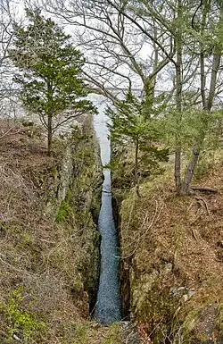 Purgatory Chasm, at the intersection of Tuckerman Avenue and Purgatory Road in Middletown (often mis-identified as being in Newport), is a narrow cleft on the east side of Easton Point which splits the Purgatory Conglomerate in a dramatic fashion.[7][8] The chasm is 120 feet long, 10 feet wide at the top, and over 150 feet deep.[9]