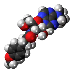 Puromycin is an aminonucleoside antibiotic, derived from the Streptomyces alboniger bacterium,[1] that causes premature chain termination during translation taking place in the ribosome. Part of the molecule resembles the 3' end of the aminoacylated tRNA. It enters the A site and transfers to the growing chain, causing the formation of a puromycylated nascent chain and premature chain release.[2] The exact mechanism of action is unknown at this time but the 3' position contains an amide linkage instead of the normal ester linkage of tRNA. That makes the molecule much more resistant to hydrolysis and stops the ribosome.