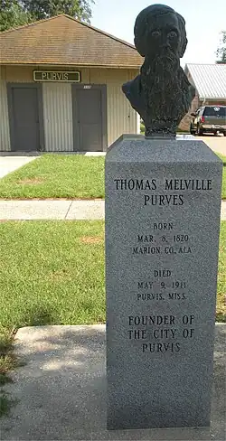 Purvis is a U.S. city in and the county seat of Lamar County, Mississippi.[3] It is part of the Hattiesburg, Mississippi Metropolitan Statistical Area. The population was 2,175 at the 2010 census. The Town of Purvis was incorporated on February 25, 1888 [4] and was founded by and named after Thomas Melville Purves, originally of Marion County, Alabama. Purves, born March 8, 1820, was a second generation Scottish-American; his grandfather emigrated to Charleston, South Carolina in 1765.[5]