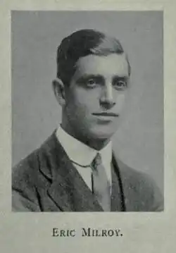 Eric Milroy was born in Edinburgh on 4 December 1887,[1] the second son of Alexander MacLeod Milroy, a bank agent, and Margaret Walteria Milroy. His siblings were Jessie, Rowatt, and Margaret.[2] He went to school at George Watson's College from 1895 to 1906. As well as playing scrum-half for the first XV in his final year, he was a scholar and a skilled debater in the Literary Society. Winning a bursary to Edinburgh University in 1906, he studied mathematics, graduating with a Master of Arts with honours in 1910.[3] Thereafter he took up an apprenticeship with the firm of Messrs A & J Robertson, chartered accountants, and himself became a chartered accountant in 1914.[4]