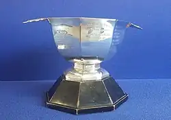 The Auld Alliance Trophy, first presented in 2018 to the winner of the Six Nations match between Scotland and France, honours the French and Scottish rugby players who fell in the First World War.[34] Inscribed on the Trophy are the names of Milroy and of the French aviator Marcel Burgun, Scottish and French captains in 1914.[35] The trophy was carried on to the pitch at Murrayfield on 11 February 2018 by Lachlan Ross and Romain Cabanis, 11-year-old descendants of the families of Milroy and his French counterpart.[36]