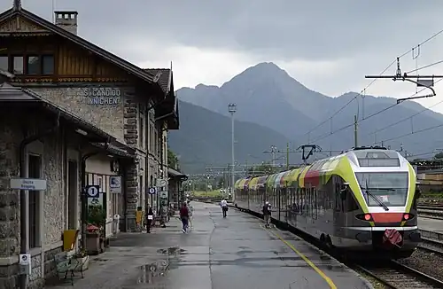 The Puster Valley Railway (German: Pustertalbahn; Italian: Ferrovia della Val Pusteria) is a standard gauge, single-track railway line in the Puster Valley between Franzensfeste (Italian: Fortezza) and Innichen (San Candido), South Tyrol, Italy. The line branches off the Brenner Railway in Franzensfeste and runs via Bruneck and Toblach to Innichen, where it continues as the Drava Valley Railway (Drautalbahn).