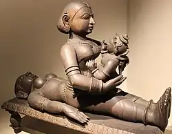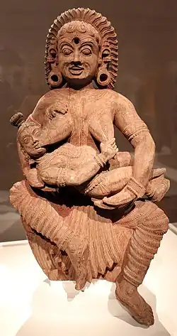 Putana is portrayed as a bird in sculpture and myth. Kushan images of Putana as a bird are found in Mathura, Deogarh and Mandor.[4] In a third-century version of Harivamsa, Putana is called the "nurse of Kamsa", who comes to a child as a female bird (shakuni), and is one of many birdlike female divinities mentioned in Harivamsa.[26] Putana's bird form symbolizes desire of materialistic objectives.[12] In some texts, Putana is described as a Vaki, a female crane, thus a symbol of crookedness and hypocrisy.[28]