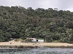 The main access to Puysegur Point and the lighthouse is via a track from a beach landing point at Otago Retreat — a narrow waterway between the mainland and Coal Island in Preservation Inlet to the north west of the point.[8] The name Otago Retreat originates from the passage of the schooner Otago that found shelter in this narrow passage during a voyage accompanying the survey ship HMS Acheron on a survey of the South Island around 1850–51.[9][10][11] There are buildings remaining at the landing that formerly served the lighthouse. One of the buildings is a Department of Conservation shelter, known as the Landing Shed.[12]