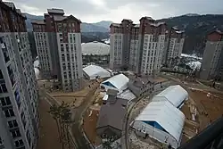 The Pyeongchang Olympic Village is a complex of high-rise apartments in Pyeongchang County, South Korea. As an Olympic Village, it hosted the attendees (which included competitors and their coaches) during the 2018 Winter Olympics. For the games, it was composed of eight 15-story buildings and was host to a dining facility, a laundry facility, a general store, a bank, a post office, and recreation center.[1]
