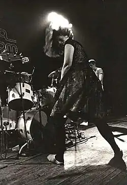 Pylon played their first live show at a party on March 9, 1979.[9] Despite receiving a relatively cool reception at their first two concerts, members of the B-52's attended Pylon's third show, where "they started dancing and running around like crazy and everybody else did too", according to Briscoe Hay.[6] Fred Schneider and Kate Pierson of the B-52's were particularly supportive and helped promote Pylon's music in New York City, getting them a gig at Hurrah.[10] After Schneider passed Hurrah's manager Jim Fouratt a Pylon demo tape, Fouratt called the band and offered their choice of opening slots for a number of upcoming headlining bands: they chose to support the Gang of Four. Their performance was well-received by the audience and was the subject of a positive review by Glenn O'Brien in Interview.[6]