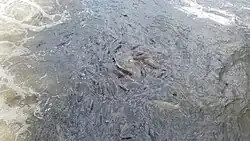 Along this spillway are a wildlife museum and the Linesville spillway, a site famous as the "Place Where the Ducks Walk on the Fishes' Backs".[2][7] Many people throw bread into the water here, and the resulting density of fish (carp) enables the ducks and other waterfowl to walk on top of the carp to vie for the thrown food. The spillway was renovated in 2007.[2] The Pennsylvania Department of Conservation and Natural Resources had planned to prohibit bread as food for the carp and ducks on January 1, 2009, only permitting commercial fish food as part of an effort to clean up the area and increase its wild nature, but subsequently reconsidered.[8]