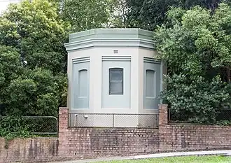 Pymble Reservoir No.1 (Covered) (WS 97) is a circular brick covered reservoir with an octagonal brick entrance chamber constructed at the centre of its roof. The entrance chamber has a conical Marseilles tile roof. The reservoir has cast iron roof ventilation caps, as at Petersham Reservoir (Covered) (WS 89), Waverley Reservoir No. 1 (Covered) (WS 132) and the Randwick Reservoir (WS 001).[1]