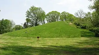 Based upon the published results of the 1874 Smithsonian survey, an amateur antiquarian writing in the 1890s remarked on the relationship of Pyramid Mound to larger archaeological sites in the east central United States. Besides proposing that it was related to the large geometric earthworks that the Hopewell built in Ohio, he suggested that Pyramid and several other mounds near Vincennes marked the northeastern boundary of a confederacy that was centered at the Mississippian city of Cahokia near St. Louis, Missouri, although he appeared not to understand the substantial cultural differences between the two peoples of "Mound Builders."[4] Two different histories of Vincennes and its vicinity, published in 1886 and 1911, regarded Pyramid Mound and the other nearby flat-topped mounds as evidence of prehistoric religious sites comparable to the pyramids of the Aztecs in Mexico City.[5][6]