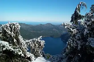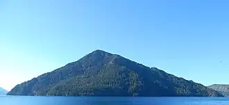 Pyramid Mountain is located high above Lake Crescent's north shore.[3] Once known as Sugarloaf Mountain, it received its present name in 1928.[4] It has a restored Aircraft Warning Service lookout at the summit, which was used to watch for enemy aircraft during World War Two.[5] It dominates the view from Barnes Point and Lake Crescent Lodge. It is accessible by trail from the Spruce Railroad Trail. On a clear day, Mount Baker is visible in the Cascade Range across the Puget Sound.
