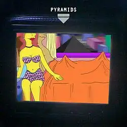 On June 8, 2012, Frank Ocean posted on his Tumblr a cryptic, almost two-minute video, promoting an unknown project which was titled Channel Orange.[9] The clip featured an expensive-looking car, and it also contained new music.[9][10] Later that day Ocean posted the full song used in the video, titled "Pyramids" onto his SoundCloud account.[11][12] Popdust noted that "trailers won’t tell you everything. For example, the brief snippet of Frank Ocean’s new track ‘Pyramids’ heard in an ambiguous trailer a few days ago left out one key detail of the track: the damn thing is 10 minutes long."[13] The cover artwork for the single features sexual The Simpsons characters.[14]