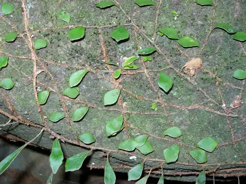 Leaves are round or tongue like in shape. 2 cm round, or up to 10 cm long and 1.5 cm broad. Sterile leaves round, fertile leaves long and tongue shaped. Round dark sori (spores) seen under the long leaves. Rhizomes orange brown in colour, long and creeping. Able to grasp onto rocks or tree trunks.