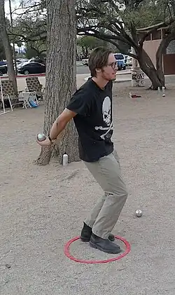 In pétanque, the objective is to score points by positioning one's boules closer to the target ball than those of the opponent after all boules have been thrown. This is achieved by throwing or rolling boules closer to the small target ball, officially called a jack[2] (French: cochonnet),[3] or by hitting the opponents' boules away from the target, while standing inside a circle with both feet on the ground. The game is normally and best played on hard dirt or gravel. It can be played in public areas in parks or in dedicated facilities called boulodromes.