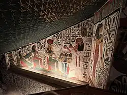 A flight of steps cut out of the rock gives access to the antechamber, which is decorated with paintings based on Chapter 17 of the Book of the Dead.[6] This astronomical ceiling represents the heavens and is painted in dark blue, with a myriad of golden five-pointed stars. The east wall of the antechamber is interrupted by a large opening flanked by representation of Osiris at left and Anubis at right; this in turn leads to the side chamber, decorated with offering scenes, preceded by a vestibule in which the paintings portray Nefertari being presented to the gods who welcome her. On the north wall of the antechamber is the stairway that goes down to the burial chamber.[6] This latter is a vast quadrangular room covering a surface area about 90 square meters, the astronomical ceiling of which is supported by four pillars entirely covered with decoration. Originally, the queen's red granite sarcophagus lay in the middle of this chamber.[6] According to religious doctrines of the time, it was in this chamber, which the ancient Egyptians called the "golden hall" that the regeneration of the deceased took place. This decorative pictogram of the walls in the burial chamber drew inspirations from chapters 144 and 146 of the Book of the Dead: in the left half of the chamber, there are passages from chapter 144 concerning the gates and doors of the kingdom of Osiris, their guardians, and the magic formulas that had to be uttered by the deceased in order to go past the doors.[6]