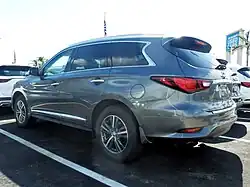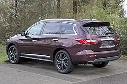 The Infiniti QX60, called the Infiniti JX until the 2014 model year, is a mid-size luxury crossover SUV with three-row seating produced by Infiniti, the luxury vehicle division of Japanese automaker Nissan. It is underpinned by an elongated Nissan Murano platform also used by the Nissan Pathfinder.[1]