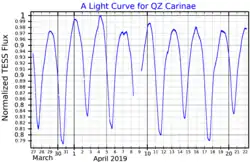- ^ a b c d e Mayer, P.; Harmanec, P.; Zasche, P.; Brož, M.; Catalan-Hurtado, R.; Barlow, B. N.; Frondorf, W.; Wolf, M.; Drechsel, H.; Chini, R.; Nasseri, A.; Pigulski, A.; Labadie-Bartz, J.; Christie, G. W.; Walker, W. S. G.; Blackford, M.; Blane, D.; Henden, A. A.; Bohlsen, T.; Božić, H.; Jonák, J. (2022). "Towards a consistent model of the hot quadruple system HD 93206 = QZ Carinæ. I. Observations and their initial analyses". Astronomy and Astrophysics. 666: A23. arXiv:2204.07045. Bibcode:2022A&A...666A..23M. doi:10.1051/0004-6361/202142108.
