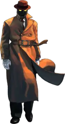 Thought Q's exact height is never stated, he is established as one of the tallest characters in Street Fighter III.[5] His outfit consists of a brown trenchcoat, matching fedora with a red band, white gloves, black pants, and black shoes. Under his jacket he wears a white shirt and a tie. His face is covered by a metal mask which has two glowing robotic yellow eyes, and is locked to his head by a keyhole on the left hand side where the ear should be. Design notes for his character stated that he should feel emotionless and robotic, while also feeling like he's "being manipulated from behind the scenes".[6]