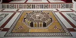 The tazar is the raised sitting platform. They are located in the iwan. In the complete composition of the qa'a, there are two iwans flanking the durqa'a at the sides. The tazar is where the male guests would be seated, and then served food or coffee by the servants. In a few example, there is additional access that leads directly toward the tazar, usually this is a service access where the servants would enter to provide fruits or drinks. Recessed shelves are located on the wall on the sides of the tazar, this is where ceramic bowls, ewers, carved metal works, or books were displayed.[3] The walls may also be decorated with Arabic calligraphy, usually of poetry, a dominant form of art in the Islamic world. Mashrabiyas are sometimes used to cover recesses on the side walls of the two iwans. Sometimes there's also a decorative niche (masab), which is treated like a kind of niche found in mosques, with miniature muqarnas decorating the miniature ceiling of the niche.[4][3]