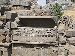 The monument known as Es-Serai (also Seraya, "palace") dates from around the 2nd century AD and was originally a temple, and then, from the 4th/5th centuries, a Christian basilica. It is 22 m long, and was preceded by an outside portico and an atrium with eighteen columns.